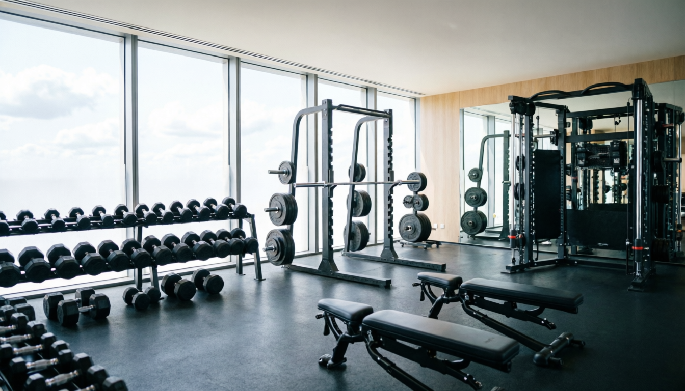 Для тренажерного зала площадью 100–150 квадратных метров базовый комплект включает 6–8 кардиотренажеров (беговые дорожки, эллипсы, велотренажеры), 4–6 силовых станций или универсальных тренажеров, а также набор свободных весов: гантели от 2 до 24 кг с шагом 2 кг, штанги и диски общим весом до 500 кг. Дополнительно потребуется инвентарь для функциональных тренировок — фитболы, медболы, эспандеры, гири и коврики для йоги.