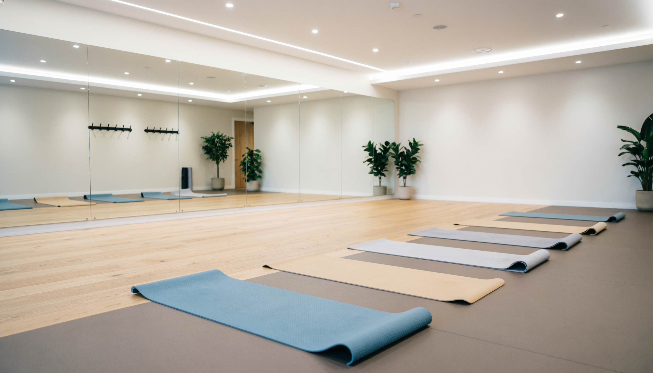 Пол в тренажерном зале требует особого внимания. Покрытие должно быть износостойким, амортизирующим и нескользким даже при попадании влаги. Резиновые модульные покрытия толщиной 8–12 мм считаются оптимальным выбором для большинства зон. В зоне свободных весов рекомендуется использовать более толстое покрытие — до 20 мм — для гашения ударов при падении дисков и гантелей.