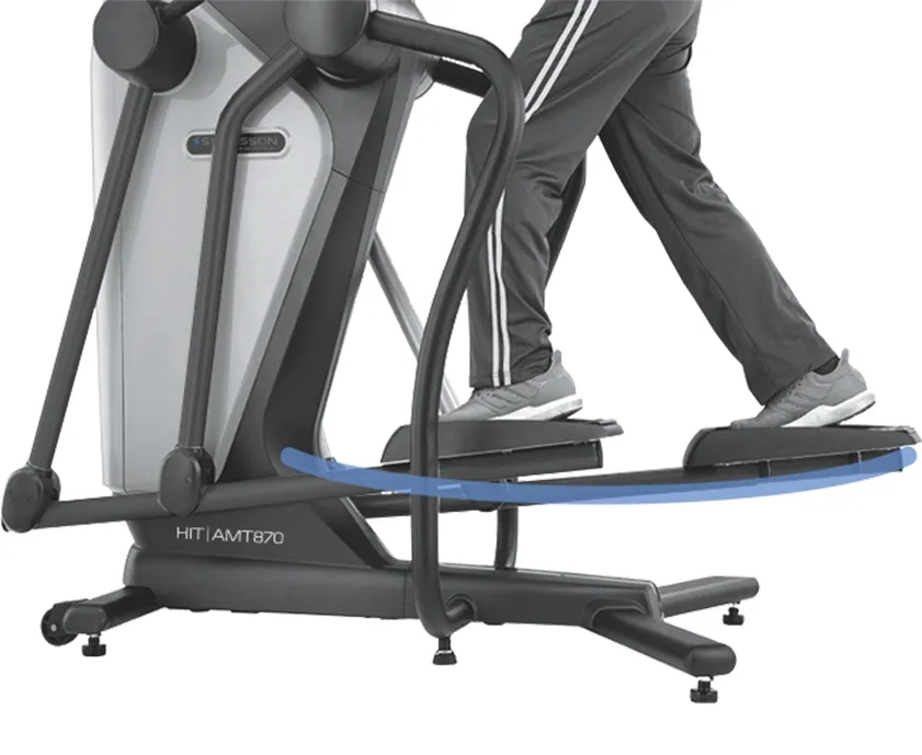 Это уникальный инновационный продукт, объединяющий в себе функции нескольких типов тренажеров. По сути это адаптивный тренажер, построенный на технологии плавающих педалей. Уникальность тренажера состоит в том, что пользователь сам выбирает траекторию, а не двигается по изначально заданной. HIT AMT870 дает полную свободу настройки движения педалей под себя, ограничивая пользователя лишь максимальной длиной и высотой шага (92 и 28 см соответственно). Тем не менее, стоит выделить 6 основных упражнений, которые можно выполнить на этом тренажере: