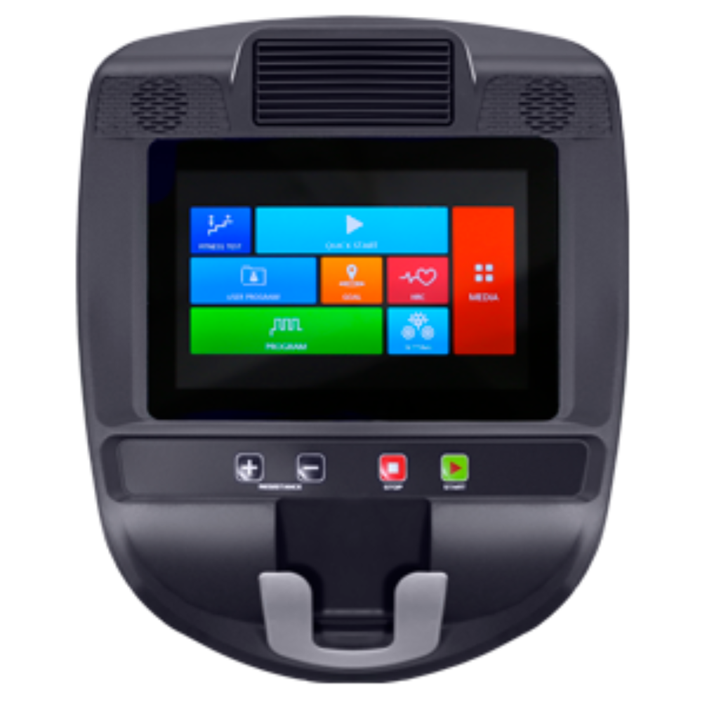 10,1-дюймовый сенсорный цветной TFT дисплей. Показания консоли: время, скорость, дистанция, уровень нагрузки, программный профиль, калории, пульс, темп (обороты в мин.), ватт, фитнес тест, отображение итогов тренировки. |
