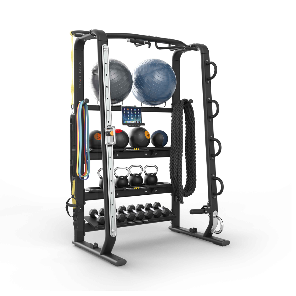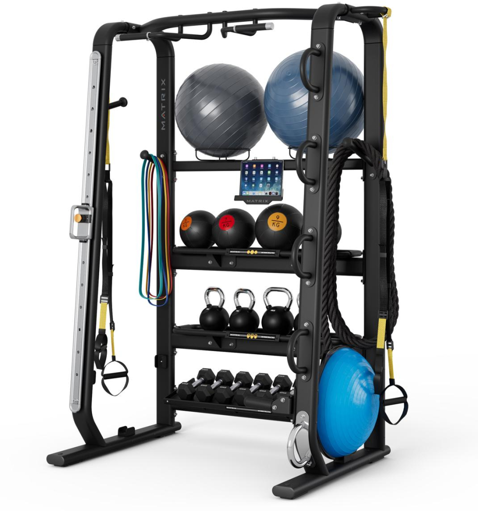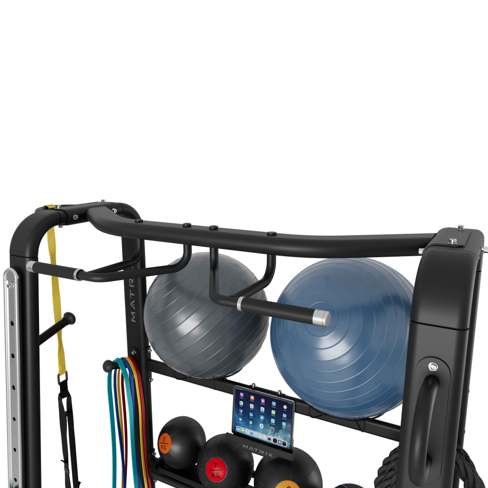 - Хранение: 3 расположенные по центру прочные полки с резиновой вставкой для популярных аксессуаров для тренировок.