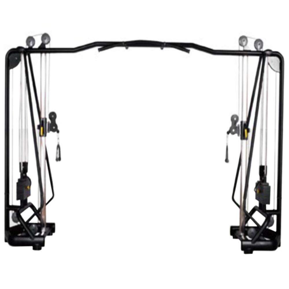 Профессиональный кроссовер с усиленной станиной и толстым профилем. Нагружается весовыми плитами, по 80 кг. на каждую из двух сторон. Турник прилагается. Защита стека отсутствует.