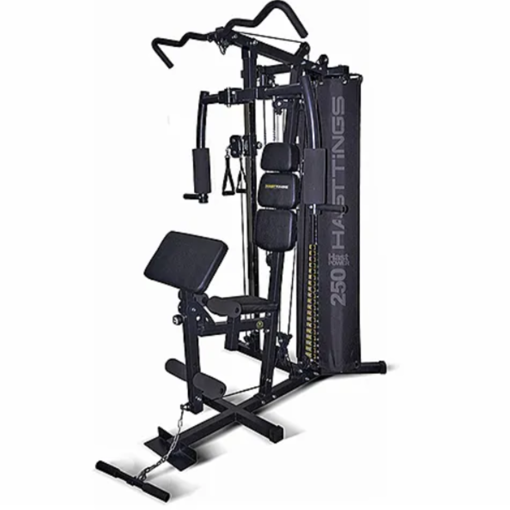 Общий вес стека составляет 70 кг. Весовые плиты покрыты виниловой оболочкой, что снизит уровень шума во время тренировок. Ролики с подшипниками обеспечивают плавное движение без рывков. Легкая регулировка спинки для дополнительного комфорта при выполнении упражнений. В комплект входят дополнительные аксессуары: грифы для тяги, манжета для тренировки мышц бедра и ягодичных мышц, комплект блочных ручек. Мультистанция HastPower 250 — это сочетание отличной биомеханики и функционального дизайна.