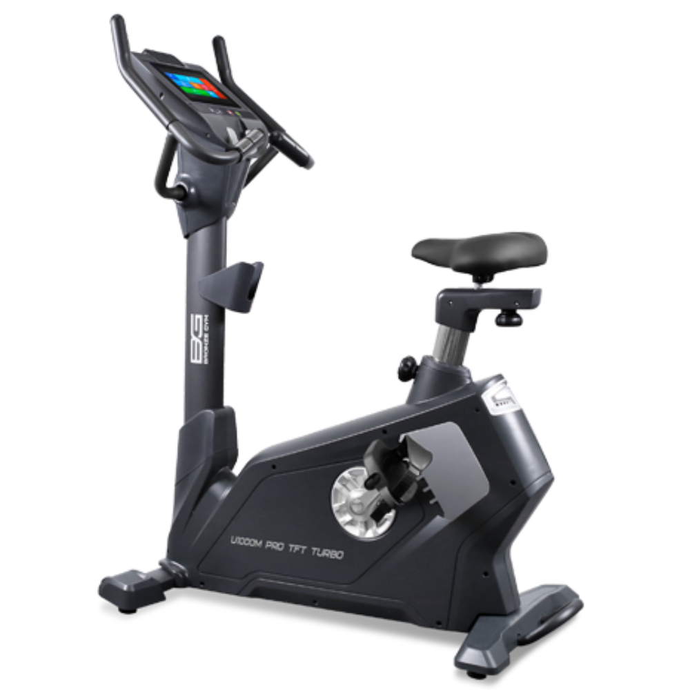 U1000M PRO TFT TURBO оборудован удобным сиденьем анатомической формы. Есть возможность регулировки в вертикальном и горизонтальном положении. Рифленые самобалансирующиеся педали с прорезиненными многопозиционными ремешками создают надежное сцепление на любых скоростях. Велоэргометр удобно перемещать благодаря двум транспортировочным роликам и ручке, расположенной сзади, а точное горизонтальное положение обеспечивают компенсаторы неровностей пола.