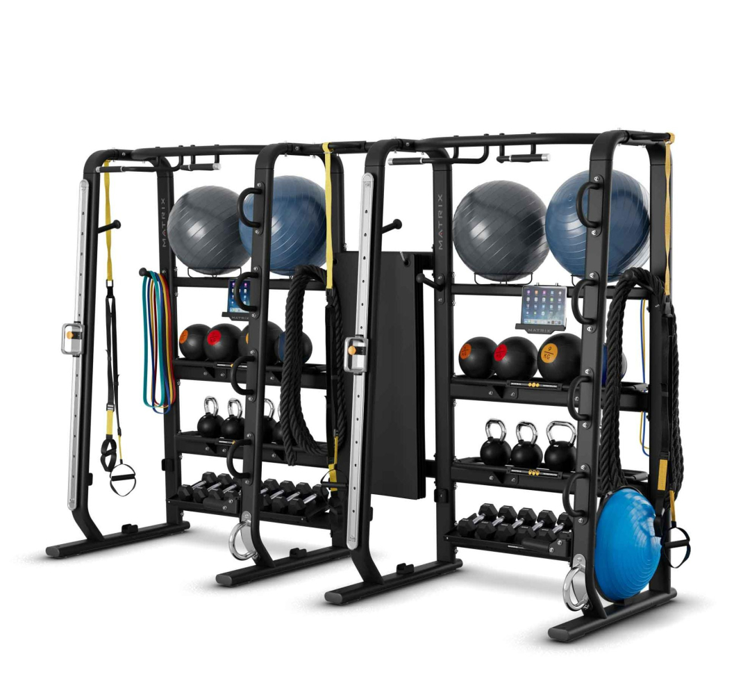 - Хранение: 3 расположенные по центру прочные полки с резиновой вставкой для популярных аксессуаров для тренировок.