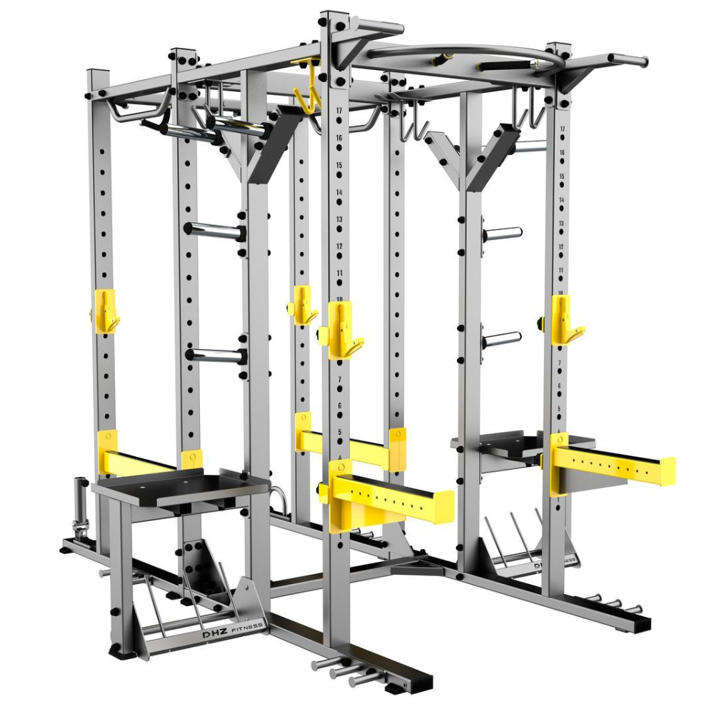 Предназначена для безопасного занятия со штангой. Силовая рама оснащена регулируемыми по высоте страховочными упорами и фиксаторами для штанги, которые можно подстраивать под рост спортсмена или под конкретные тренировки, так же это позволяет установить скамью для выполнения упражнения жим из положений сидя или лежа. Вверху силовой рамы имеются удобные рукояти, выполняющие функцию турника. Страховочные упоры сделают упражнения со штангой более безопасными и менее травмоопасными для спортсменов. Для устранения повреждения напольного покрытия рама установлена на пластиковые опоры.